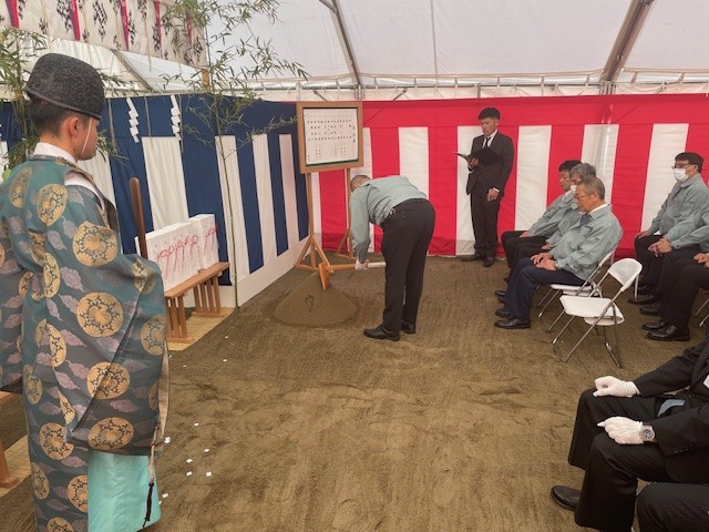 当日は清々しい天候に恵まれ、神職による安全祈願の儀式が粛々と進められました。祝詞奏上、敷地のお清め、鍬入れの儀などを通じ、工事の安全と新社屋の発展を祈り込める厳かなひとときとなりました。